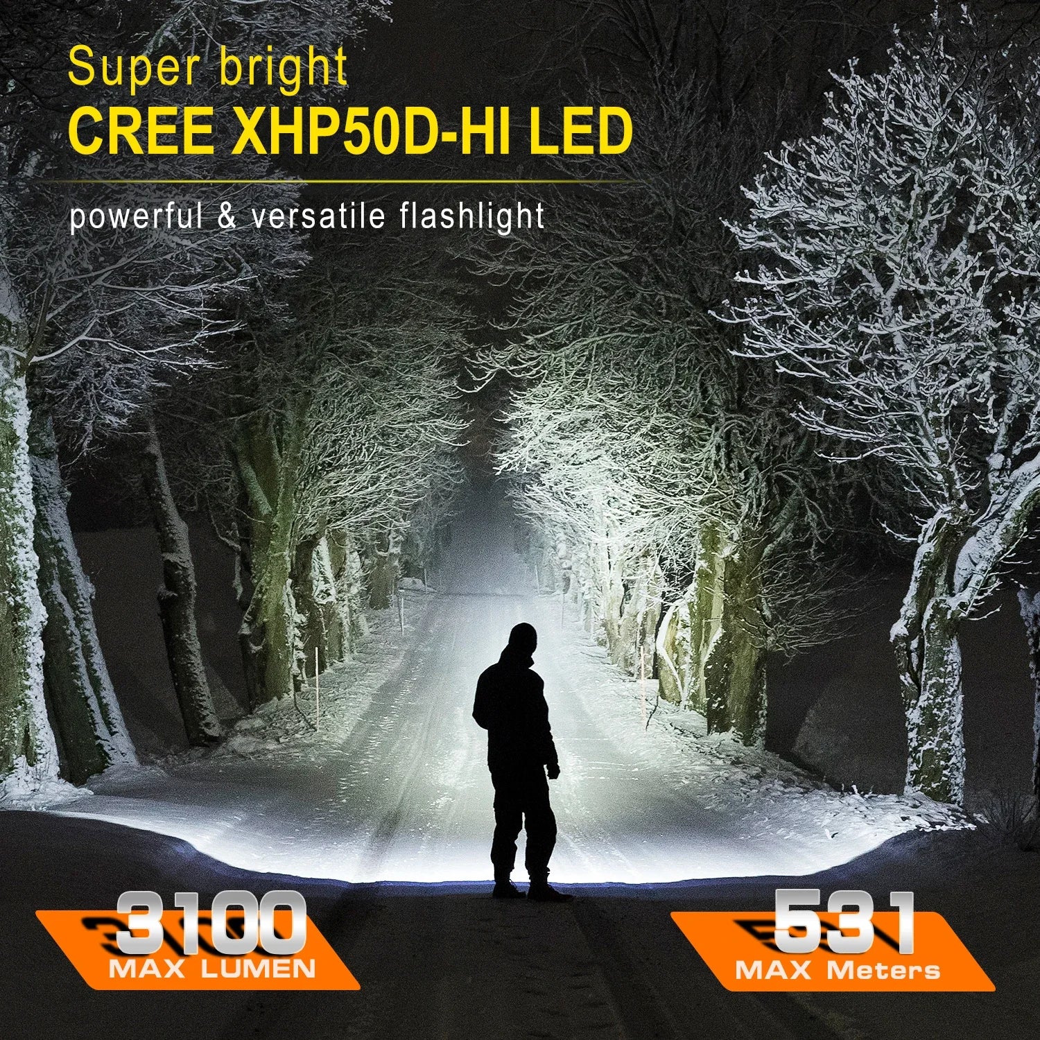 - Experience maximum brightness with the XHP50D-HI LED, delivering up to 3100 lumens for crisp, far-reaching illumination during camping, hiking, fishing, or search tasks.