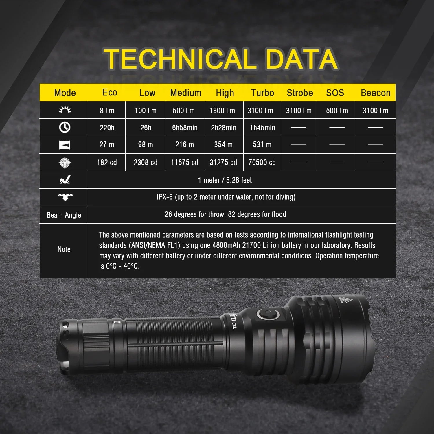- Smart features include Mode Memory that recalls the last brightness level, Advanced Temperature Regulation (ATR) that auto-adjusts at 50°C, and intuitive dual-switch control (tactical tail switch and side switch) for quick, versatile operation.